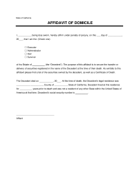 A California affidavit of domicile is a legally binding document used to verify details of the deceased. Such include the name and their place of residence when they died. It should be written following the California state laws for it to serve the purpose.