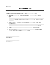 A California gift affidavit is a legally binding document that is used to confirm that a particular item was given to a person as a gift. The Affidavits of gifts are used when the gifted items are expensive and an ownership transfer is happening. Having legal proof makes the entire process seamless.