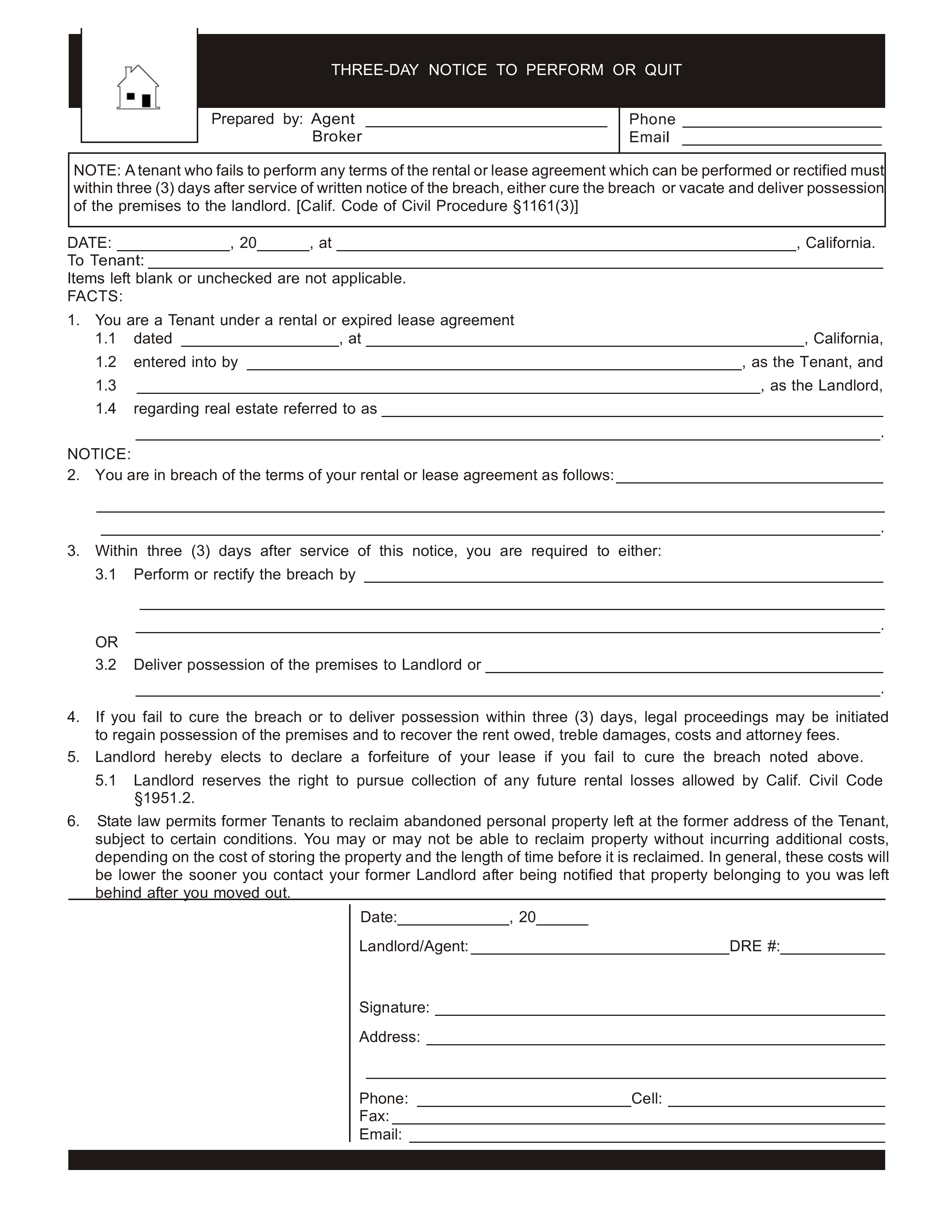 At the top, details of the broker or agent who prepared the notice must be entered including the name, phone number, and email.