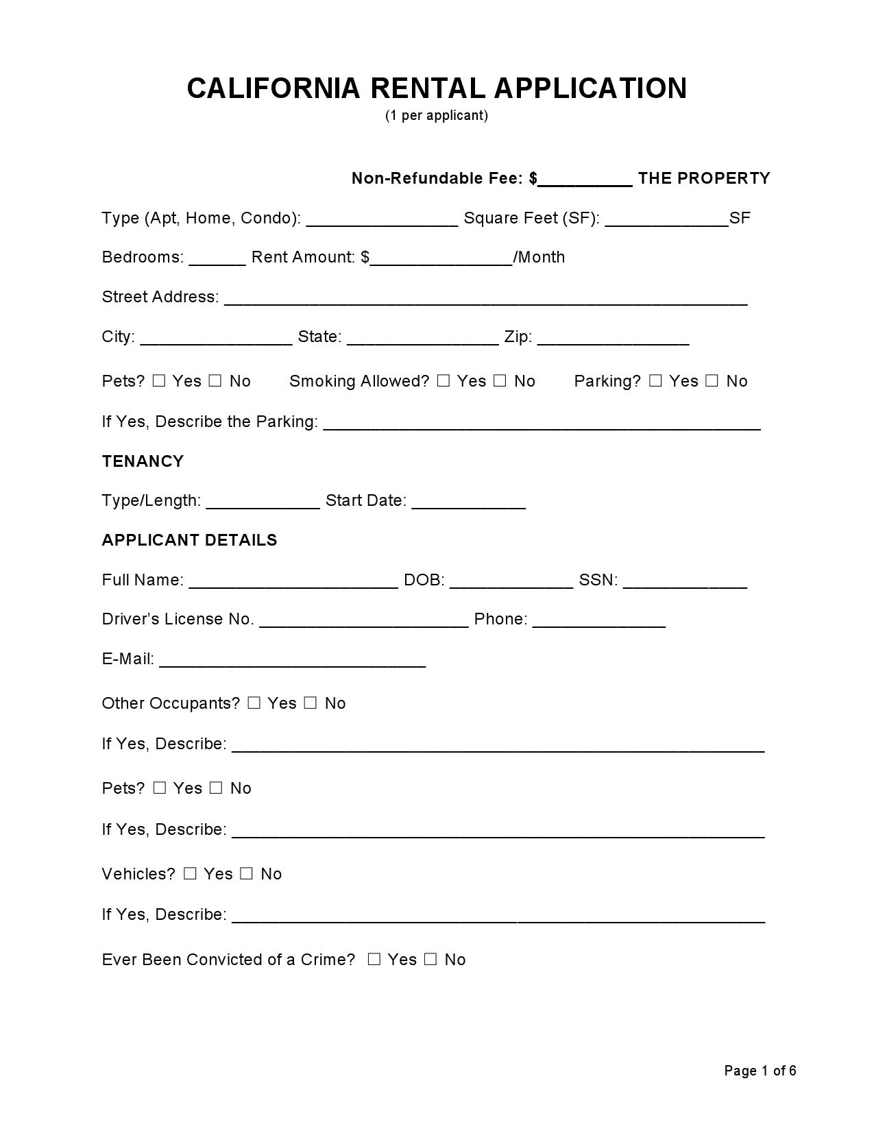 - Yes or no answers to questions regarding pets, vehicles, convictions, bankruptcy, and evictions.